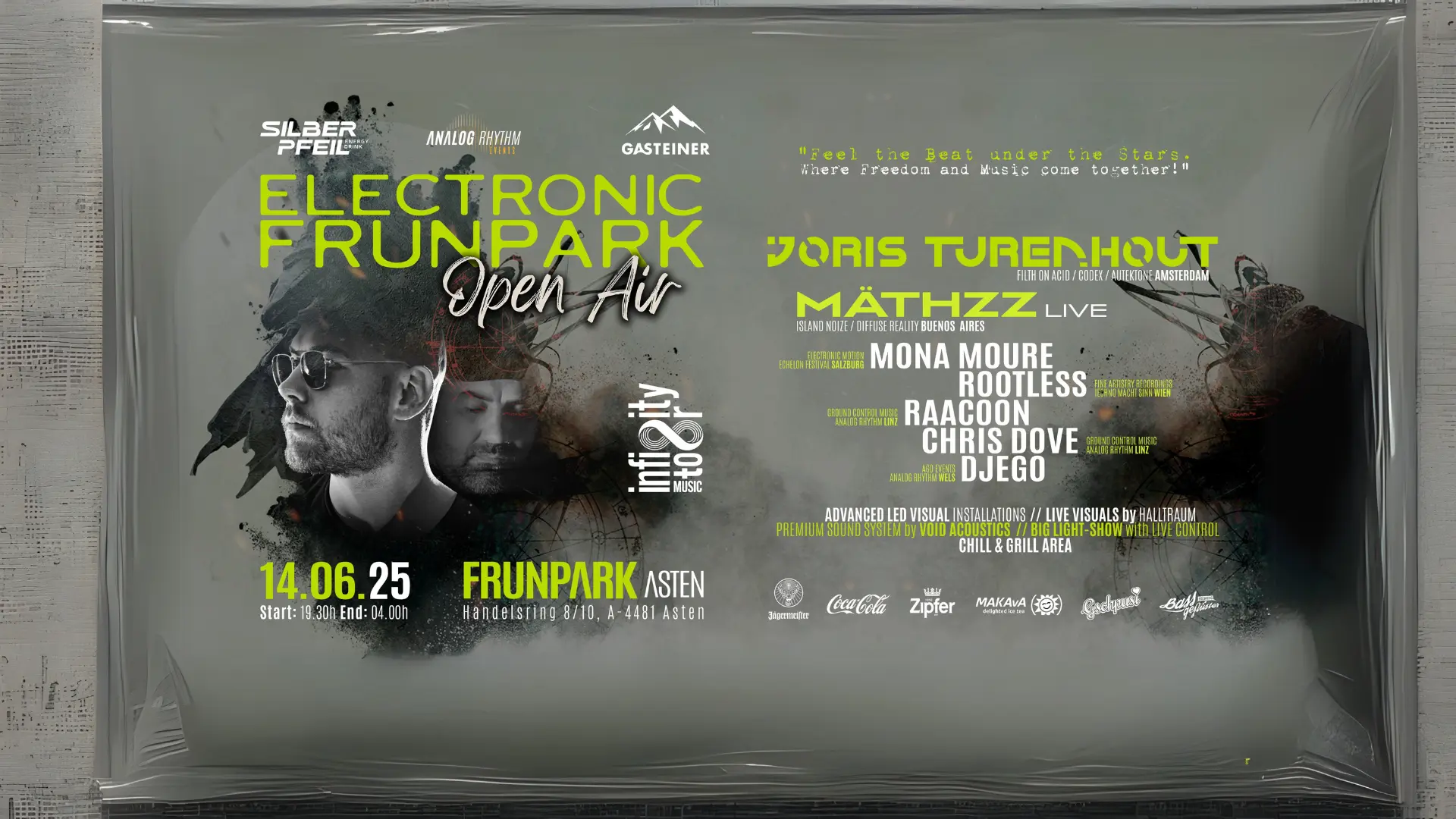 Der Frunpark Asten wird wieder zum Electronic Frunpark Open Air und liefert auch dieses mal wieder feinsten Electronic, Techno und Melodic Techno! Euch erwarten erstklassige Visuelle Installationen und Live Visuals b Halltraum, ein Premium Sound System von Void Acoustigs, eine fesselnde Live-Lichtshow und zum Runterkommen eine Grill & Chill Area. Auf dem Line Up stehen u.a. Joris Turenhout aus Amsterdam, Mäthzz aus Buenos Aires, Mona Moure aus Salzburg und viele mehr. Seid dabei, wenn es wieder heißt: Feel the beat under the stars - where freedom and music come together!